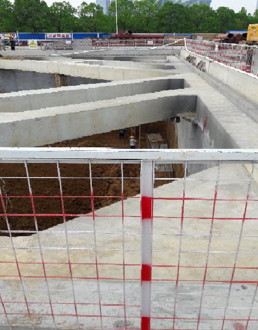 臺,標(biāo)準(zhǔn)段主體結(jié)構(gòu)為地下二層單柱雙跨鋼筋混凝土框架結(jié)構(gòu),采用明挖順做法施工;車站總長度193m,標(biāo)準(zhǔn)段寬度為20.7m,標(biāo)準(zhǔn)段基坑深度平均16.4m。