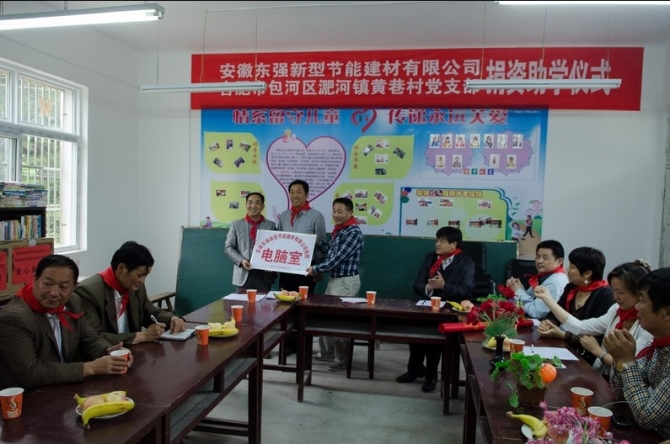 在捐資儀式上,董事長倪修倫親手將十臺價值三萬余元電腦,交給了涼亭小學(xué)校長手上。董事長說,作為一個成熟的企業(yè)來說,有責(zé)任關(guān)愛山區(qū)的教育事業(yè),今天的捐贈活動是關(guān)愛山區(qū)教育事業(yè)的第一步,今后要把關(guān)愛行動持續(xù)下去??偨?jīng)理深情的說,今天回到家鄉(xiāng),回到母校,倍感親切,我懷著感恩的心,報答家鄉(xiāng),報答母校。合肥市包河區(qū)淝河鎮(zhèn)黃巷村黨總支也向涼亭小學(xué)捐贈了電腦操作臺,書記黃帥在捐贈儀式上作了講話。