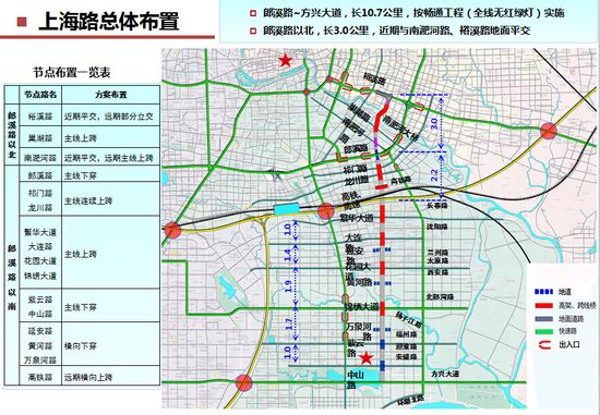 上海路暢通工程(郎溪路—方興大道)由中鐵十局承建,長10.7公里,按暢通工程(全線無紅綠燈)實施;郎溪路以北至裕溪路,長3.0公里,近期與南淝河路、裕溪路地面平交。巢湖路及南淝河大橋節(jié)點:南淝河大橋主線跨過巢湖路落地,南淝河大橋采用下承式鋼桁架橋,橋面寬40米,雙向六車道,主跨130米。該項目主題結構設計使用年限為100年,全部采用耐久性砼。